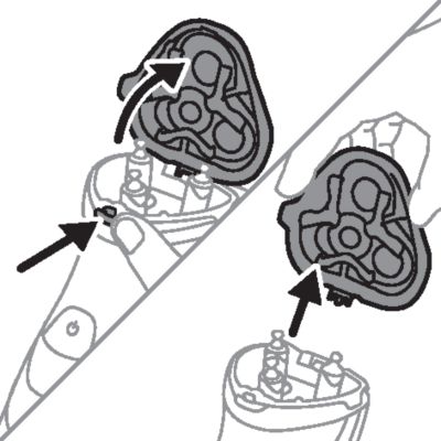9. Note: Make sure that the shaving heads with the projections fit exactly onto the hooks of the shaving head holder when placing them. The shaving heads supplied with the shaver either have notches or projections. Both shaving systems are the same.