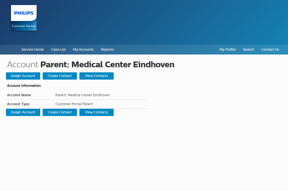 Since your Healthcare facility can consist of multiple locations, departments etc., Philips Healthcare creates Accounts in its Event Management System to group the assets (medical devices). To make sure all dedicated accounts are visible in the Customer Services Portal for our customer we have created a Parent account to which these related accounts are assigned. If an asset, service case or service contract is not visible or information is not accurate displayed in the Customer Services Portal, please contact your local Philips Customer Services Portal contact.